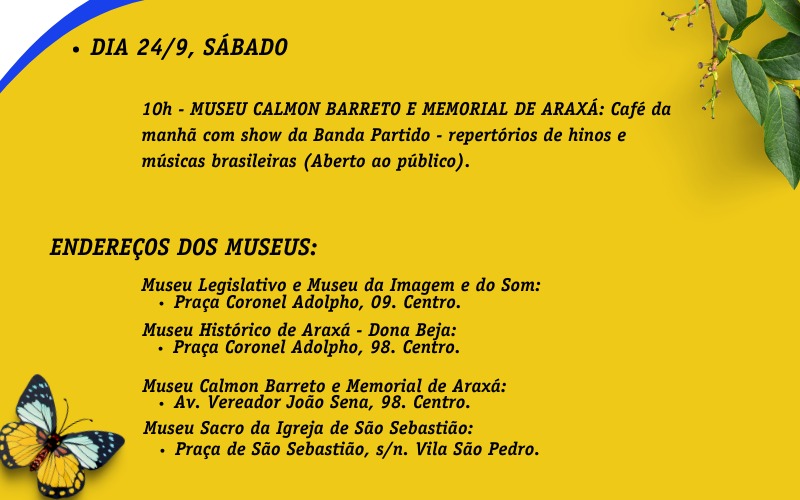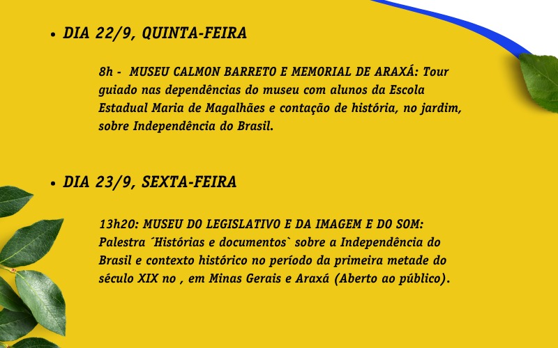 Em Araxá, os museus terão atividades gratuitas voltadas a comunidade em geral e a alunos de escolas da cidade. Palestras, bate-papos, exibição de filmes, encenação do grito do Ipiranga e show musical estão entre os destaques da programação.